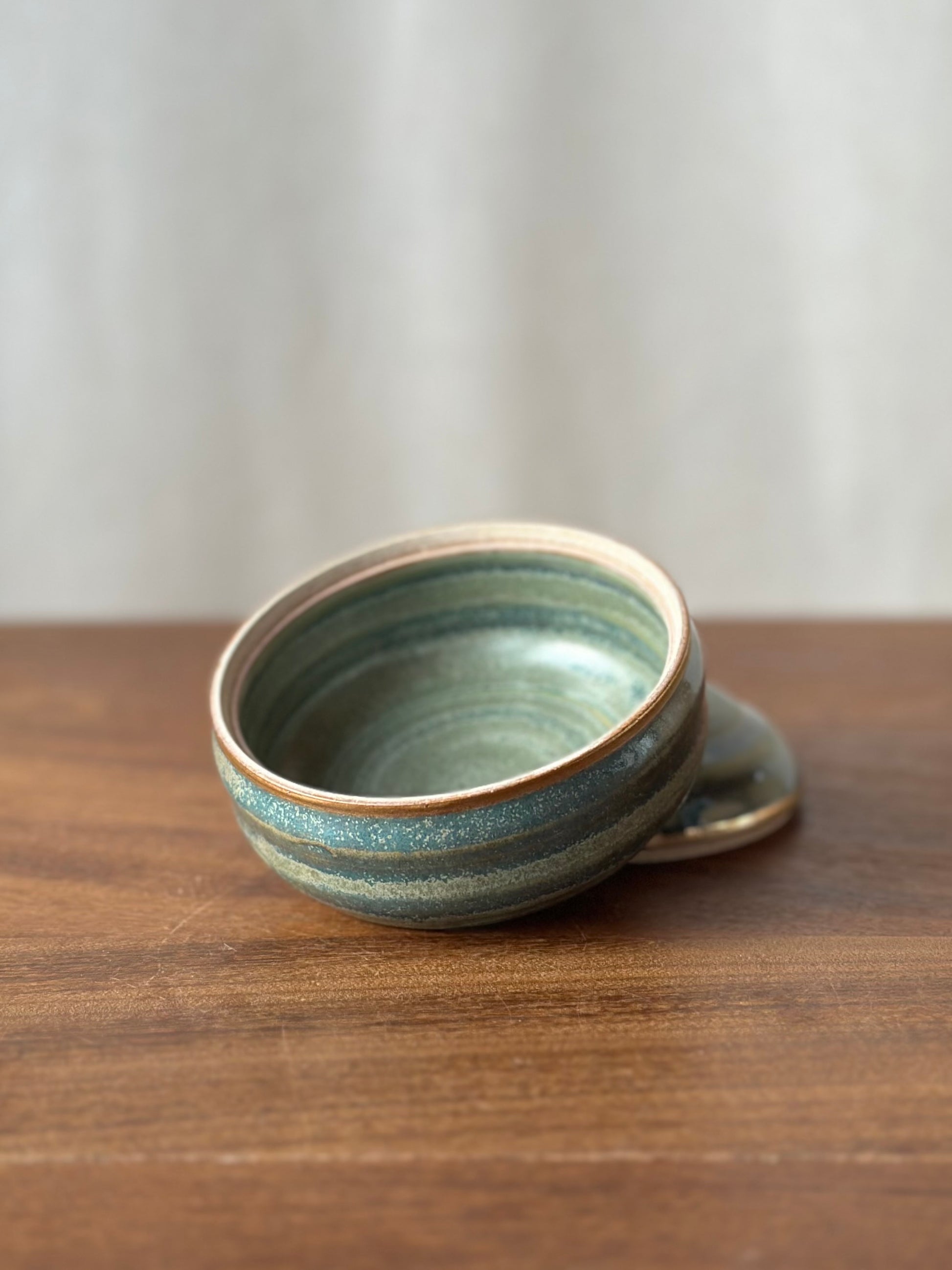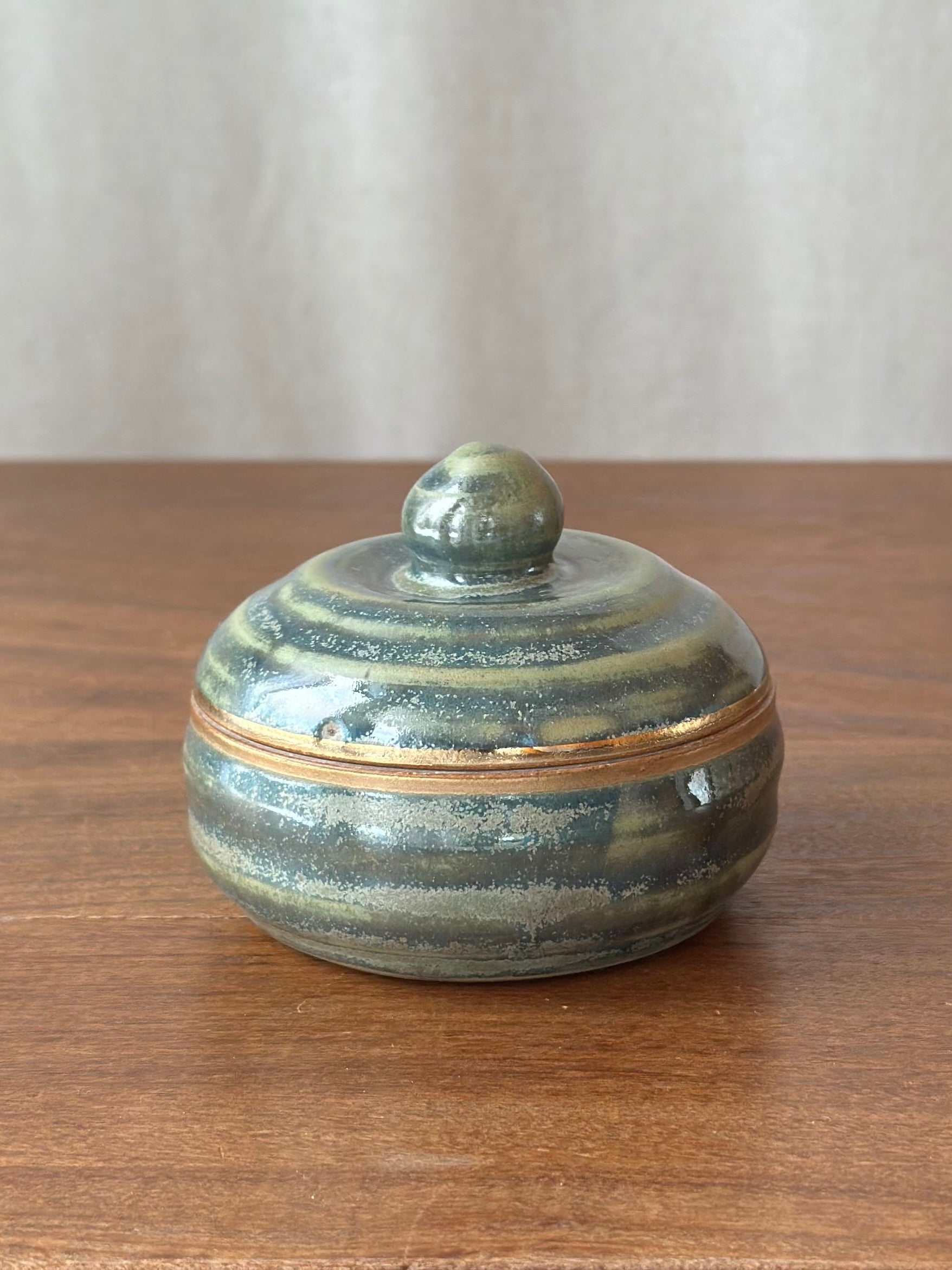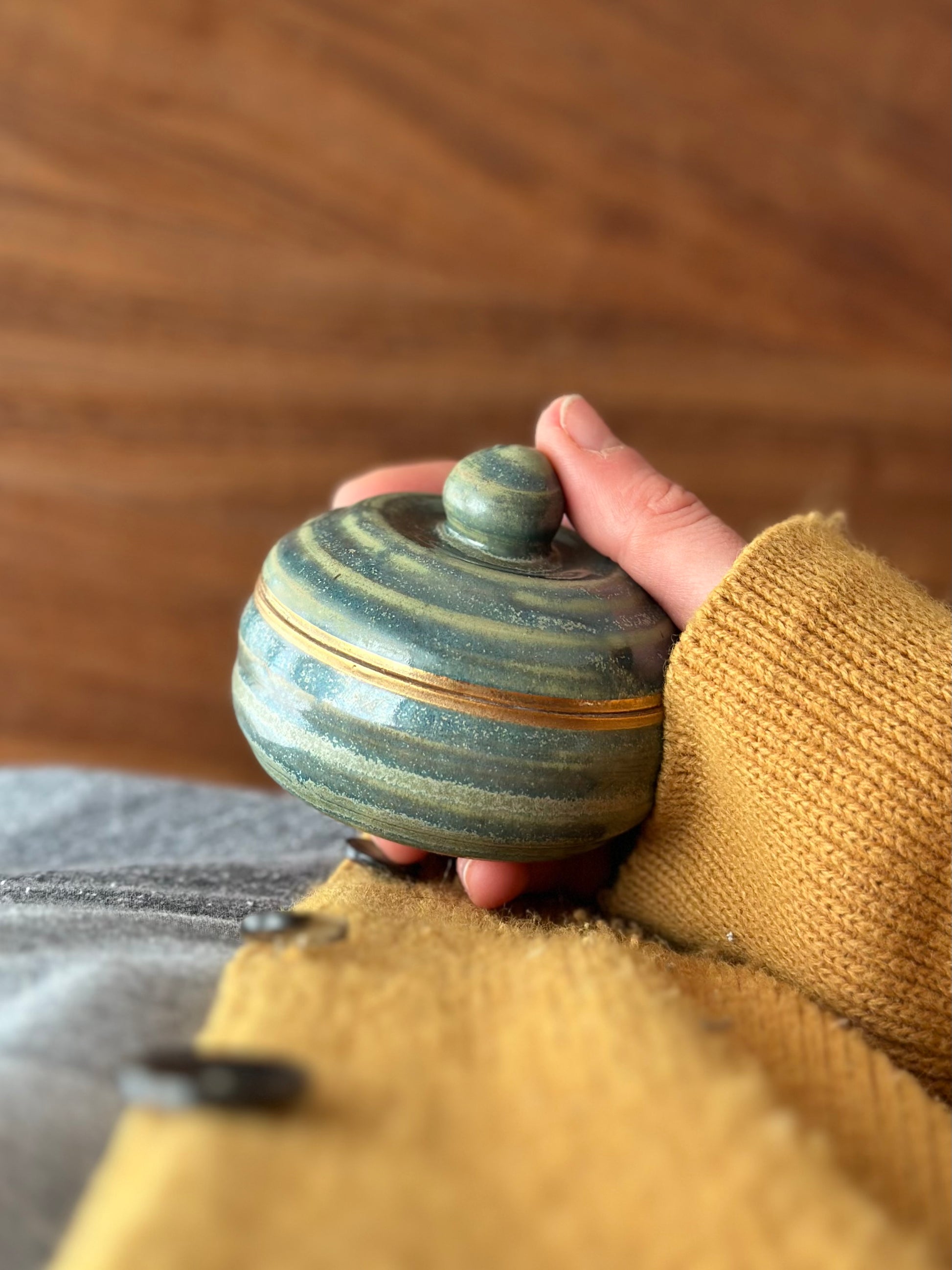 Store your treasures in style with this jar. Made from reclaimed warm beige stoneware, this trinket jar features a crystal moss glaze.