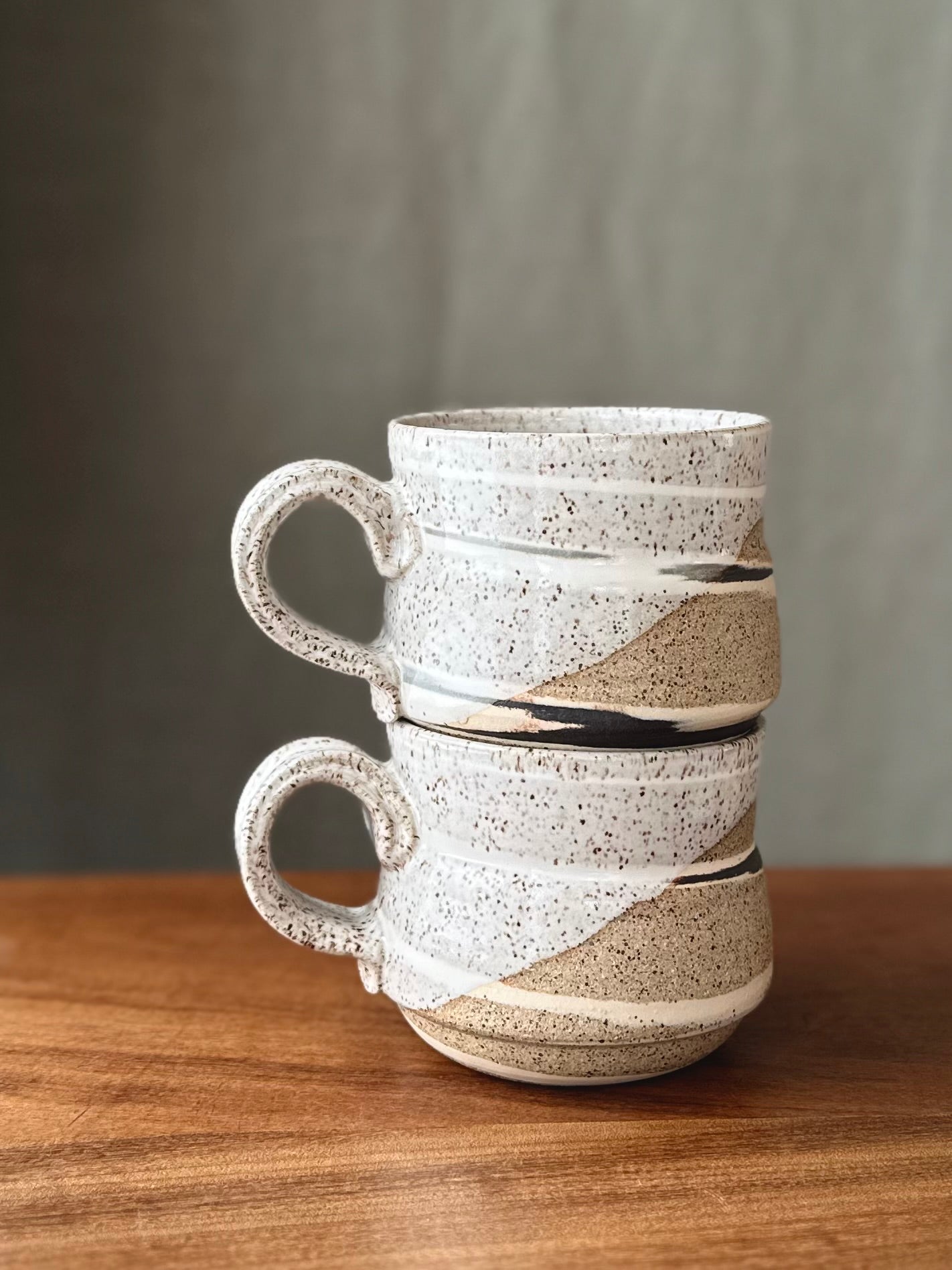 Handmade mugs with skirted accent made from marbling three stoneware clays. It features a comfortable handle and is finished in eggshell glaze.